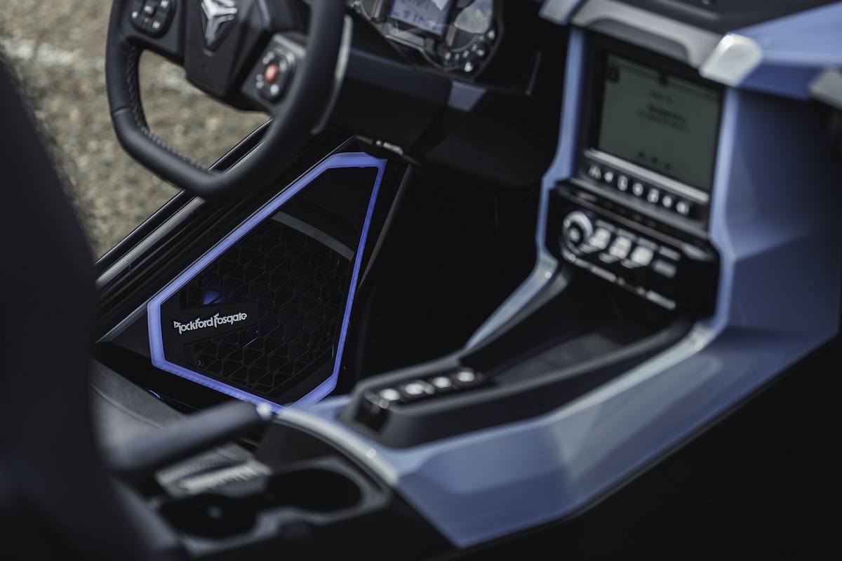 Inside the cockpit, the 2026 Polaris Slingshot Signature Edition doubles down on the idea that this is meant to be an experience vehicle, not just a weekend toy. The standout factory-installed upgrade is the Rockford Fosgate Stage 3 Max + Lighting system, which transforms the cabin into a full 360-degree audio and lighting environment. Polaris equips it with two 8-inch side panel speakers and two 6.5-inch headrest or roll hoop speakers, producing 700 watts of audio output. That means this is not background music for a casual cruise. It is an immersive sound setup designed to match the Slingshot’s visual drama.